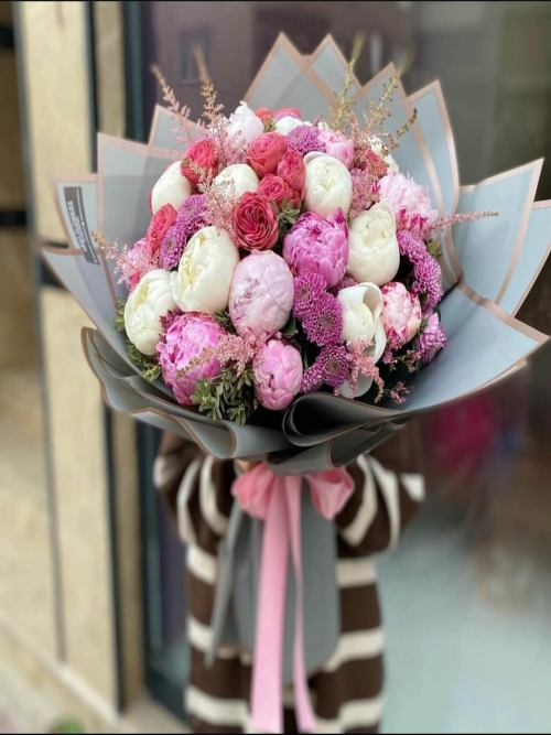 Pembe şakayık ve beyaz şakayıklardan aralarında mevsim çiçeklerinden gerek anastasya gerek diğer ihal çiçeklerle desteklenmiştir.